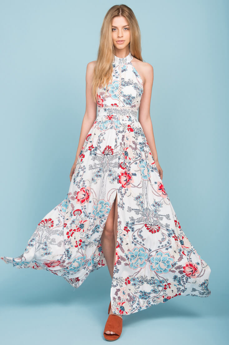 Formal or fun! Harmonious halter neckline with keyhole slit at bust. Pair with comfy flats and a denim jacket to fight the breeze.